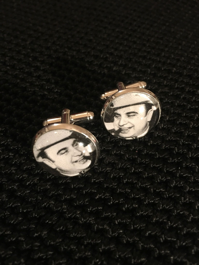 Boutons de manchettes en métal argenté avec cabochons en verre à l'effigie de Al Capone.