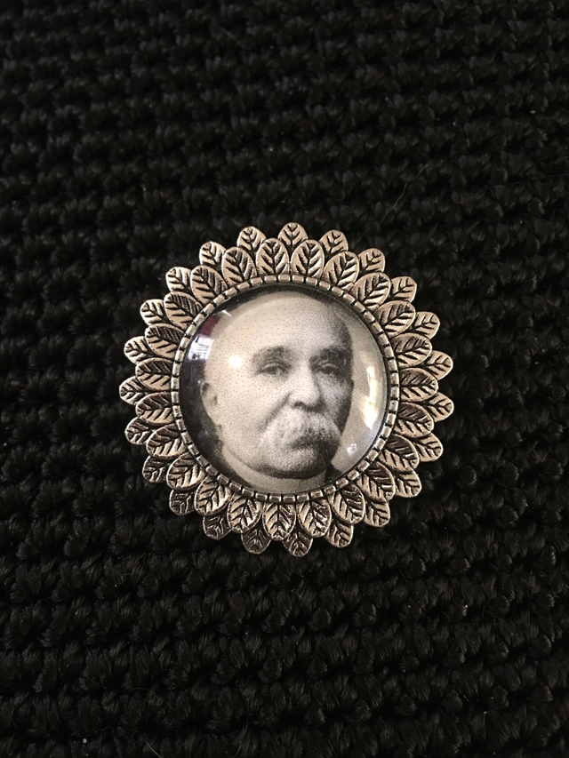 Broche en métal argenté avec cabochon en verre épais à l'effigie de Clémenceau.