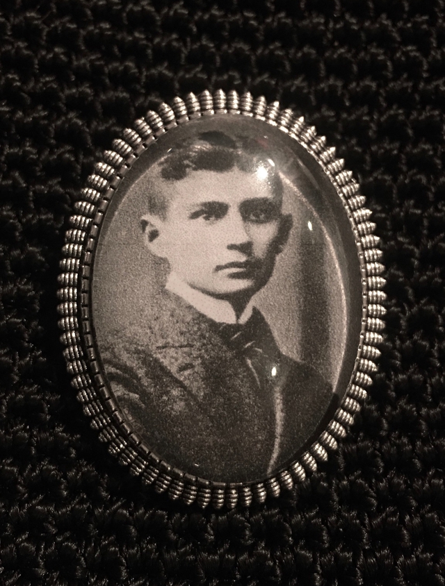 Broche en métal argenté avec cabochon en verre épais à l'effigie de Franz Kafka.