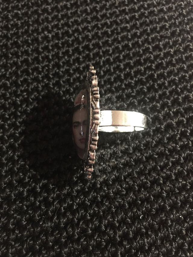 Bague réglable en métal argenté de style marquise avec cabochon en verre à l'effigie de Frida Kahlo.