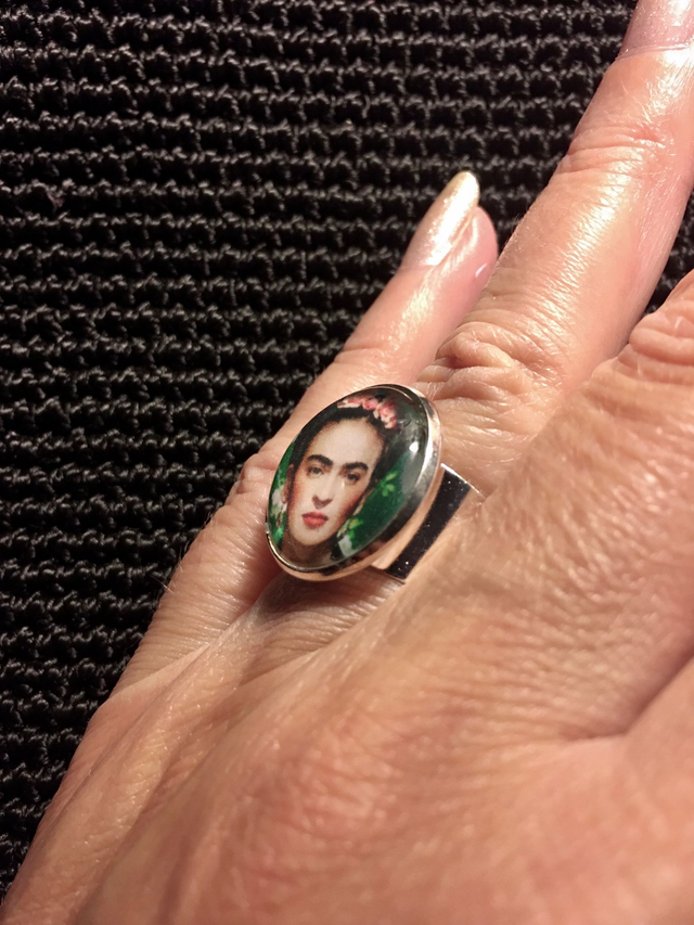 Bague réglable en métal argenté avec cabochon en verre à l'effigie de Frida Kahlo.