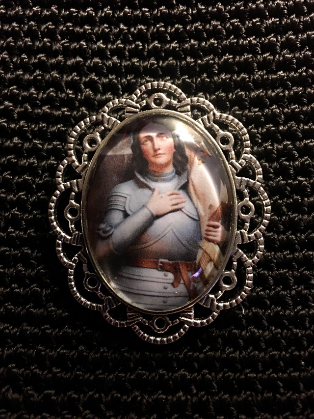 Broche en métal argenté avec cabochon en verre épais à l'effigie de Jeanne d'Arc.