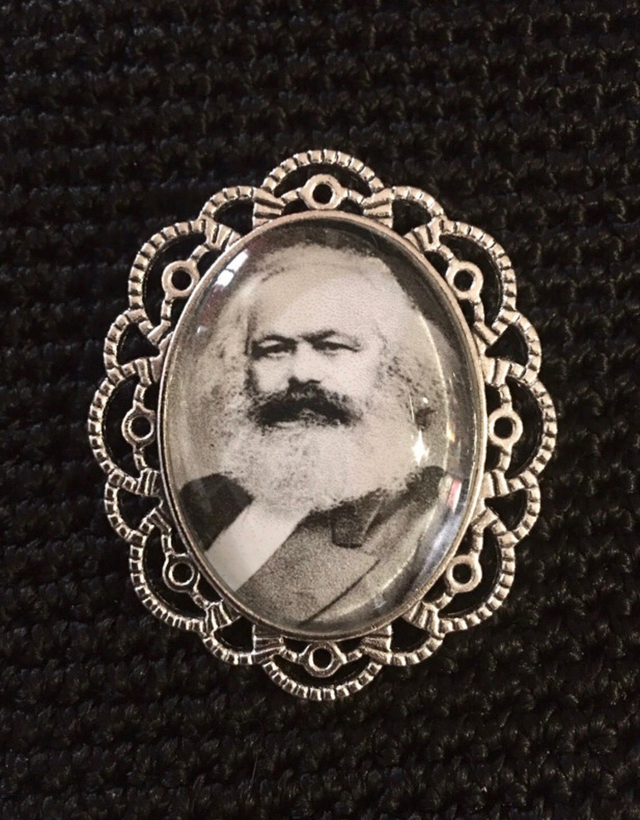 Broche en métal argenté avec cabochon en verre épais à l'effigie de Karl Marx.