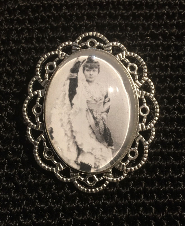Broche en métal argenté avec cabochon en verre épais à l'effigie de "La Goulue" (Louise Weber).