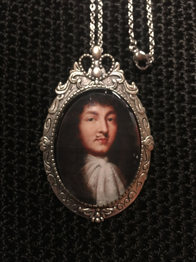 Pendentif broche 2 en 1 en métal argenté avec cabochon en verre épais à l'effigie de Louis XIV.