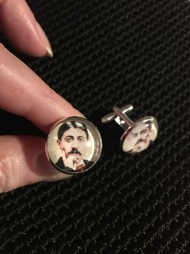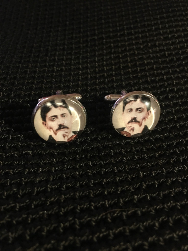 Boutons de manchettes en métal argenté avec cabochons en verre à l'effigie de Marcel Proust.