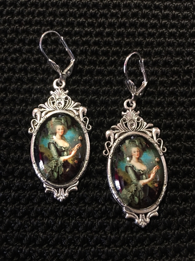 Boucles d'oreilles dormeuses en métal argenté avec cabochons en verre à l'effigie de Marie-Antoinette.