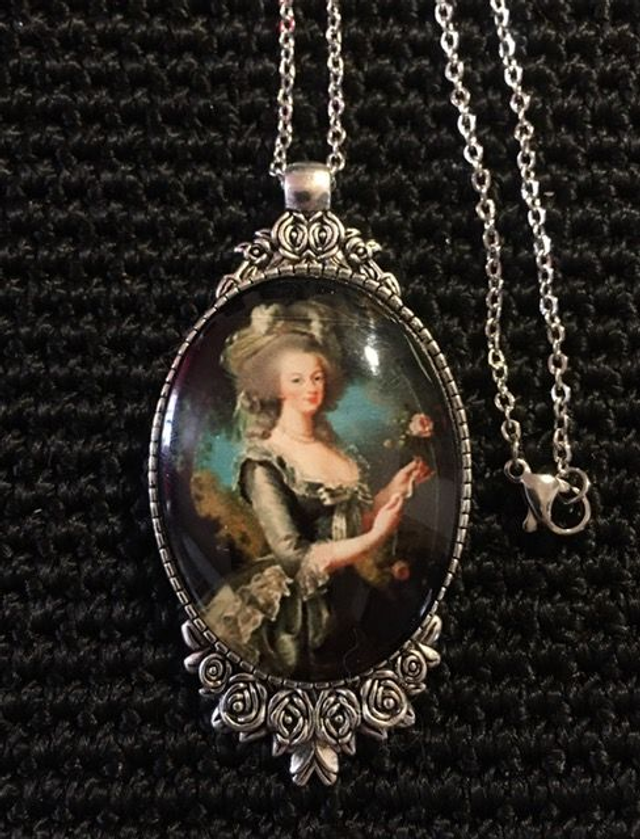 Pendentif en métal argenté avec cabochon en verre épais à l'effigie de Marie-Antoinette.