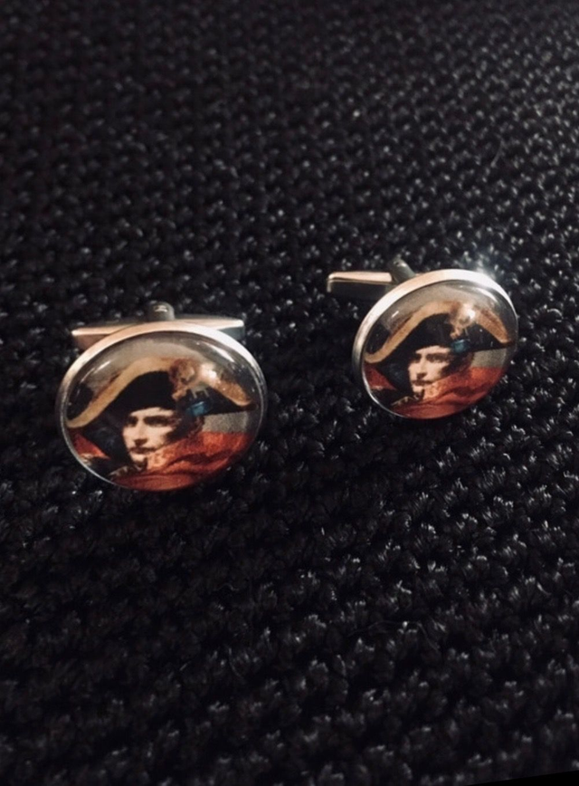 Boutons de manchettes en métal argenté avec cabochons en verre à l'effigie de Napoléon Bonaparte.