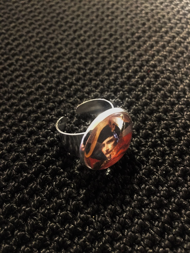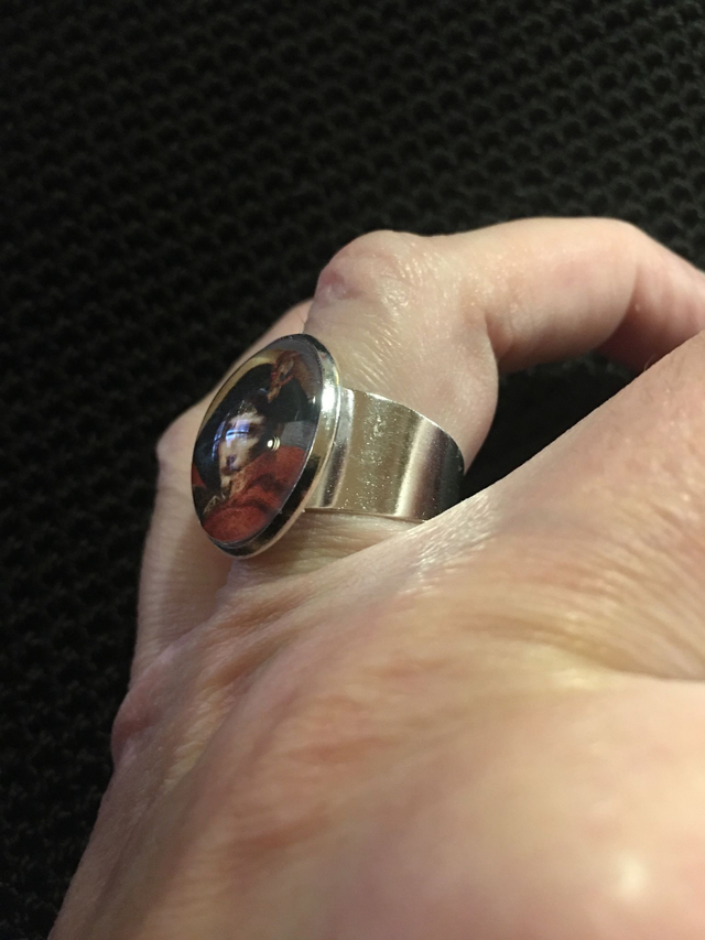 Bague réglable en métal argenté avec cabochon en verre à l'effigie de Napoléon Bonaparte.