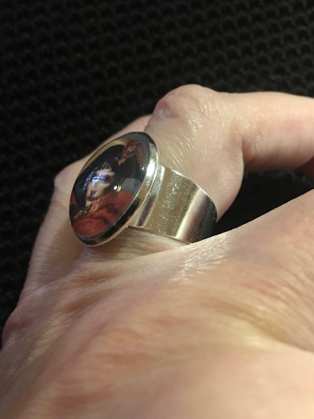 Bague chevalière réglable en métal argenté avec cabochon en verre à l'effigie de Napoléon Bonaparte.
