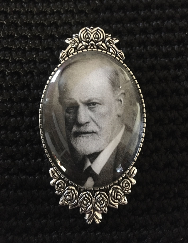 Broche en métal argenté avec cabochon en verre épais à l'effigie de Sigmund Freud.