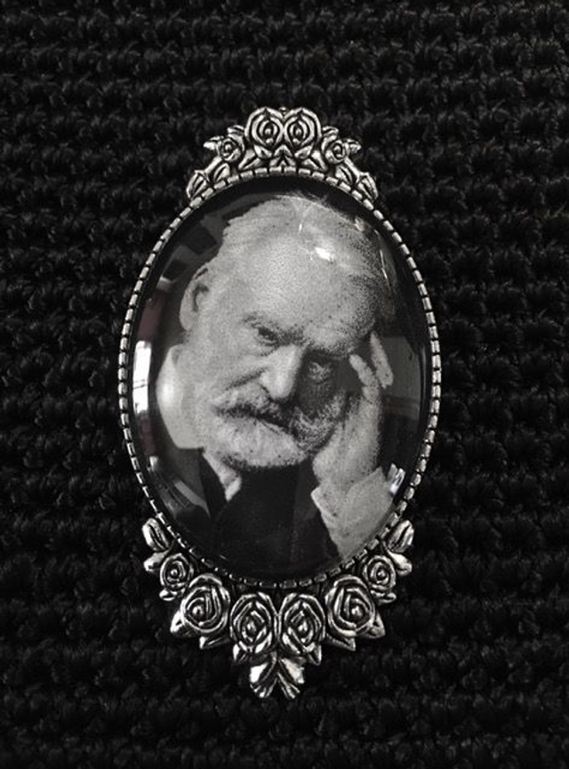 Broche en métal argenté avec cabochon en verre épais à l'effigie de Victor Hugo.